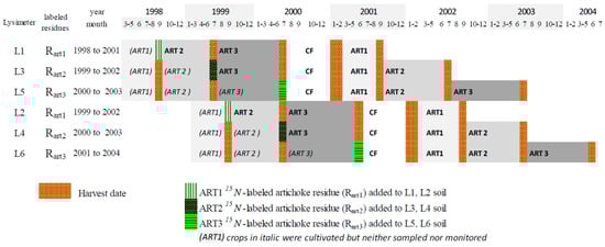 Crop rotations in six lysimeters (L1 to L6) and 15N-labeled artichoke (ART) residues applied to soil (RART1, RART2 and RART3) in ART–cauliflower (CF) rotations.
