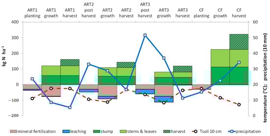 Change in mean soil temperature (Tsoil 10 cm), precipitation, N fertilization, uptake and leaching during the artichoke (ART)–cauliflower (CF) rotation.