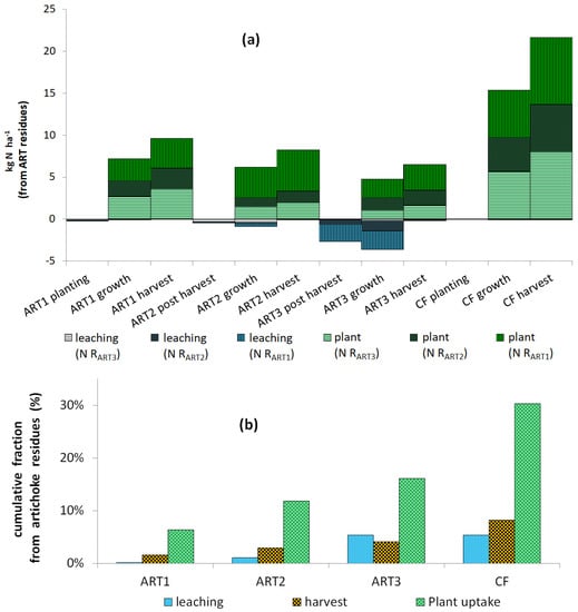 Nitrogen taken from artichoke (ART) residues: (a) distribution of RART1, RART2 and RART3 in plant and leaching; and (b) cumulative nitrogen from ART residues in leaching, harvest and total plant uptake of ART and cauliflower (CF) crops. RART1, RART2 and RART3 correspond to the artichoke residues chopped and applied to the soil after the first, second and third harvests, respectively.