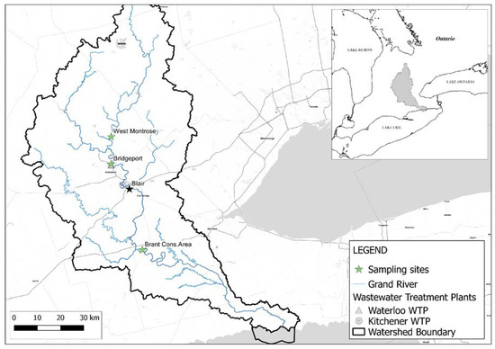 The Grand River watershed (280 km long, 6800 km2) is divided into three sections: (i) northern till plains, (ii) central moraines and (iii) southern plains with lacustrine influence [32]. The river flows approximately south into Lake Erie. This research focused on the central region, where land use is both agricultural and urban. Biweekly or three-week periodical sampling was completed from 2010 to 2013 at four locations in the central Grand River, from West Montrose in the north (43.5856 N, −80.4816 W, 98 km from headwaters) to Brantford in the south (43.1523 N, −80.3173 W, 204 km from headwaters; Figure 1). The sampling locations representing upstream conditions (relative to the urban area) were West Montrose (WM) and Bridgeport (BR). The location representing the urban area downstream of the Kitchener Wastewater Treatment Plant was Blair (BL), located 5.7 km downstream of the effluent discharge. Finally, Brant Conservation Area (BCA) was the location representing the site with cumulative effects.