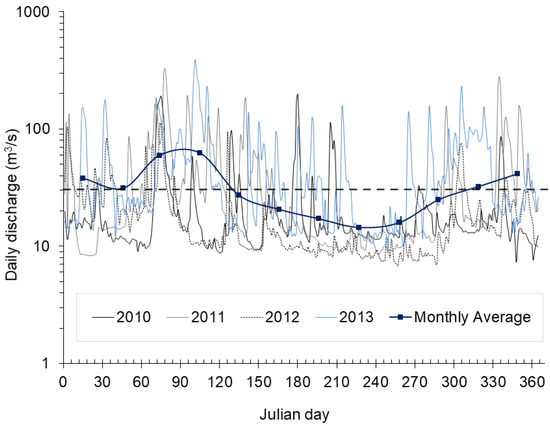 Hydrograph of the central Grand River at Blair (146 km from headwaters). Daily discharge (2010 to 2013) compared to monthly average discharge (2006–2013) for seasonal demarcation by flow regime. River discharge was obtained from the Historical Hydrometric Data Search (Water Survey of Canada) and from the Grand River Information Network (GRIN Open Data Licence v1.0).