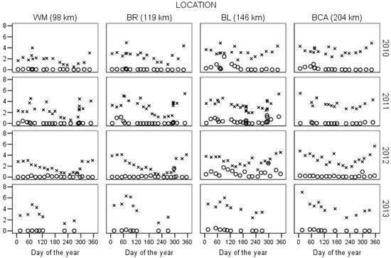 The hydrology of the Grand River does not follow the meteorological definition of seasons due to the dominance of the snowmelt period in early spring. Therefore, we proposed seasonal demarcation based on discharge data (from Water Survey of Canada). We selected the location Blair (BL) representing the central Grand River within the urban area and plotted daily discharge (m3/s; Figure 2) from 2010 to 2013 and monthly average discharge (2006–2013) in order to identify season by flow regime. We named low and high flow regime according to deviation of the monthly average from values above or below the annual average discharge (31.7 m3/s; Figure 2). Mid flow refers to discharge slightly above yearly average (around 40 m3/s). Using this hydrograph, we are also able to distinguish wet or dry years by comparing the trends between daily and monthly average discharge. In this manner, seasons were identified in Julian days as shown in Table 1. Additional criteria supporting the cut-off dates are included in Appendix A.