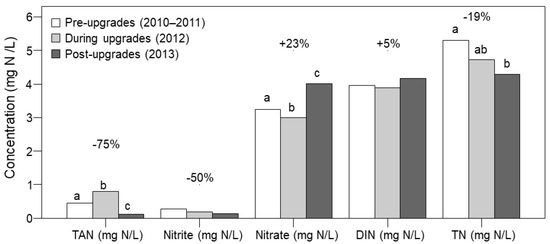 The number of sampling events per year varied; therefore, average values refer to time-weighted averages, calculated from the total of samples by season per year before and after WTP upgrades. Temperature (°C), pH and electrical conductivity (mS/cm) were measured in situ with multi-parameter probes (Hach HQ40d and YSI 560) previously calibrated. Water samples for concentrations (NH4+, NO2−, NO3− and TN) were collected in HDPE bottles, stored in ice (cooler) and the filtered in the laboratory (0.45 μm nitrocellulose filter membrane) before analyses, stored in a cold room (4 °C). Total ammonium nitrogen (TAN = NH3 + NH4+) and nitrite (NO2−) were measured by colorimetric methods [33], using a UV-VIS Beckman spectrophotometer and a Smartchem 200 Autoanalyzer (±5% precision). When nitrite was below detection limit (0.01 mg N- NO2−) it was counted as half the detection limit for all calculations. Nitrate (NO3−) was analysed with an ion chromatograph (Dionex Corp., Sunnyvale, CA, USA, ±5% precision). Total nitrogen (TN) was analyzed by acid combustion in Apollo 9000 Combustion TOC/TN Analyzer (Teledyne Tekmar) and Shimadzu TOC-L Total Organic Carbon Analyzer with TNM-L Total Nitrogen Measuring Unit (precision ±0.3 mg C/N-DOC/TN L-1). Dissolved inorganic nitrogen (DIN) was obtained by adding NO2− + NO3− + NH4+. Statistical analyses and graphics were produced with SPSS 13.0 (SAS Institute, Cary, NC, USA).