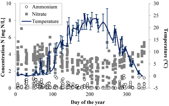 Seasonal differences observed in nitrate in the Grand River can be caused by flow because several solutes have a positive concentration–discharge (c-Q) relation, which implies that erosion or runoff is bringing most solutes [36]. Given that variable -Q patterns within one stream has been observed in long term studies [37], some intra-annual differences in DIN concentrations in the Central Grand River may be explained by the variable water temperature among (microbial activity increases with temperature) seasons and the nutrient demand from in-stream plants/algae and actively growing crops within the watershed. The difference in annual average water temperature is likely not as important as the 20 °C difference observed within a year. The seasonal effect of water temperature was observed as nitrate concentrations equal or greater than 4 mg N-NO3−/L in most locations of the Central Grand, and ammonium concentrations equal or greater than 0.5 mg N-NH4+/L as far as 164 km from headwaters from fall until mid-spring (over winter), concurrent with water temperatures lower than 15 °C (Figure 5). Assimilation for the majority of the mesophilic biota is optimal at 10 °C; thus, reductions in temperature resulted in reduced assimilation of nitrate in several algal and bacterial of different physiological types [38]. The optimum temperature for nitrification is 15 °C [39]; thus, high nitrate could be expected in low water temperature conditions. It has been found intense denitrification (and maximum N2O concentration) during summer with high water temperature and low dissolved oxygen conditions [25]. A laboratory study assessed denitrification rates in riverbed sediments which are not nitrate limited, where they found that lowering the temperature to 4 °C resulted in an approximately 77% decrease in N2O production rates [40]. Assuming that summer hypoxia will no longer be common due to the upgrades in the WTPs, it is possible that preventing hypoxic conditions might reduce denitrification in the Grand River, potentially leading to higher-than-expected nitrate concentrations, especially during warmer periods.
