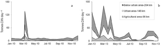 DIN loading clearly responds to variable river discharge (Figure 6). The addition of agricultural and urban inputs leads to the peaks observed at the urban area (146 km from headwaters). A warm year with close-to-average base flow (2010), showed a single, clear peak during spring melt. On the other hand, a very wet year with above-average base flow (2013) had large variability in DIN loads throughout the year. The increase in N observed downstream of the urban area (204 km) is assumed the cumulative effect of all agricultural and urban inputs, in addition to tributaries and groundwater discharges. High river discharge can also represent reduced contact time with the riverbed; thus, leading to reduced N assimilation and promoting that reactive N lingered in the water column for longer periods. Nitrogen loading is expected to increase in the Central Grand River as the population served by the WTP’s increases, or if additional agricultural nitrogen is being added to the watercourses. The Grand River Watershed Water Management Plan [22] estimated nitrate load upstream of the urban area as follows: agricultural creeks (50%), the Conestogo River (40%), the Shand dam (8%) and septic systems (2%). Tributaries upstream of the urban area might contribute to as much as 60 kg N per day during spring melt high flow (March–April) [50].