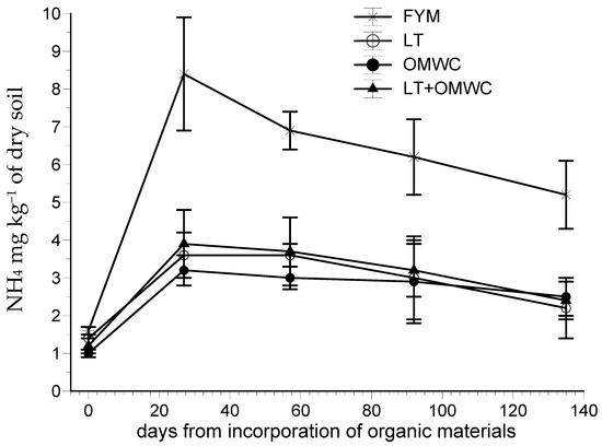 Prior to the incorporation of organic amendments, no difference in NH4-N concentrations was recorded between treatments, which ranged at low levels. After incorporation of the organic amendments to the soil, the FYM treatment exhibited significantly higher NH4-N levels in the soil compared to the other three treatments, in all subsequent measurements. In the other three treatments, the NH4-N levels were similar and below 4 mg kg−1 in all samplings (Figure 1).