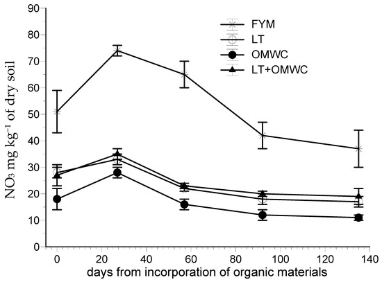 The availability of N in organic farming does not depend only on total N provided to the soil but also on the rate of N net mineralization, which provides plant-available N to plants. The consistently higher concentrations of NH4-N in the FYM treatment in all sampling dates compared to all other treatments obviously reflects higher net mineralization rates in this treatment. Nevertheless, the NH4-N concentrations were always below 10 mg kg−1, as expected, because in well-aerated soils with neutral pH and sufficient microbial activity, the nitrification process is rapid [40,41,42].
