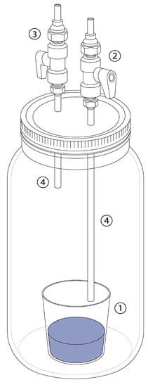 Unit used for incubation with atmospheric sampling by the system of Horgan et al. [38], consisting of a specimen container with soil (1) in a 1.9 L Mason jar equipped with a lid having inlet (2) and outlet (3) ball valves (item # 38EF92, Grainger, Lake Forest, IL, USA) connected to 6.4 mm O.D. brass tubing (4).
