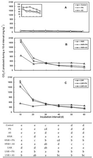 Total quantity of CO2-C produced by soil in 10 d intervals during a 60 d aerobic incubation involving the following nine treatments: (A) unamended control, potassium nitrate (PN), ammonium sulfate (AS); (B) high N residue (HNR) with or without PN (HNR + PN) or AS (HNR + AS); and (C) low N residue (LNR) with or without PN (LNR + PN) or AS (LNR + AS). Data shown as a mean from triplicate incubations with standard error bars and a table for mean comparisons. Within a given incubation interval, treatments followed by the same letter do not differ significantly at p < 0.05. When compared at a smaller scale (A), CO2-C was significantly greater (p < 0.01) for the control than for the PN or AS treatment.