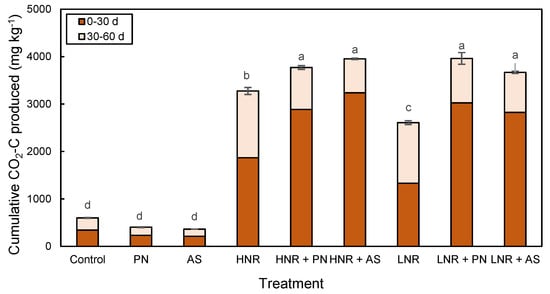 Cumulative CO2-C produced by soil during half or all of a 60 d aerobic incubation involving an unamended control and the following eight treatments: potassium nitrate (PN), ammonium sulfate (AS), high N residue (HNR) with or without PN (HNR + PN) or AS (HNR + AS), and low N residue (LNR) with or without PN (LNR + PN) or AS (LNR + AS). Data shown as a mean from triplicate incubations with standard error bars obtained for the total amount of CO2 collected. Treatments do not differ significantly (p < 0.05) for the entire 60 d incubation period when bars are accompanied by the same letter.