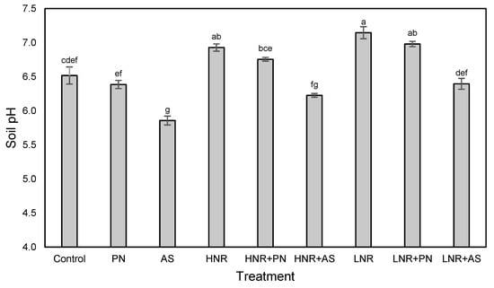 Soil pH during a 60 d aerobic incubation involving an unamended control and the following eight treatments: potassium nitrate (PN), ammonium sulfate (AS), high N residue (HNR) with or without PN (HNR + PN) or AS (HNR + AS), and low N residue (LNR) with or without PN (LNR + PN) or AS (LNR + AS). Data shown as a mean from duplicate incubations for 7 and 60 d with standard error bars. Treatments do not differ significantly (p < 0.05) when bars are accompanied by the same letter.