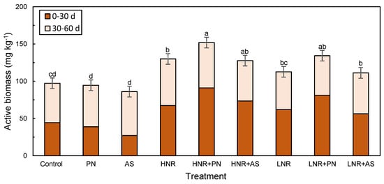 Active biomass measured at five intervals (7, 14, 30, 45, and 60 d) during a 60 d aerobic incubation involving an unamended control and the following eight treatments: potassium nitrate (PN), ammonium sulfate (AS), high N residue (HNR) with or without PN (HNR + PN) or AS (HNR + AS), and low N residue (LNR) with or without PN (LNR + PN) or AS (LNR + AS). Data for each incubation interval shown as a mean from duplicate subsamples with standard error bars. Statistical analyses were performed after averaging data for all five intervals, and treatments do not differ significantly (p < 0.05) when bars are accompanied by the same letter.