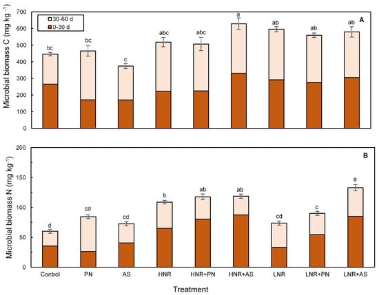 To better clarify the interacting effects of C and N on total microbial biomass, the MBN fraction was measured at the same incubation intervals utilized in characterizing MBC. The results (Figure 6B) reveal that MBN was significantly greater for the HNR, HNR + PN, and HNR + AS treatments as compared to soils incubated without residue, and with the exception of LNR + AS, significantly lower for the LNR than the HNR treatments. Both findings can be explained by differences in the supply of assimilable N, following similar reports in several previous studies [90,91,92]. A significant correlation was obtained between MBN and cumulative CO2 production (r = 0.78, p < 0.05), indicating that organic C mineralization released C and N substrates for microbial biomass synthesis [93]. For the HNR + PN and LNR + PN treatments that supplied ample C and N, MBC was 2 to 25% greater in the second than in the first month of incubation, whereas the corresponding change for the HNR + AS and LNR + AS treatments was a 10% decrease due to soil acidification. Relative to the same temporal periods, a 35 to 64% decrease in MBN was observed for these four treatments, reflecting a decline in microbial activity due to substrate limitation.