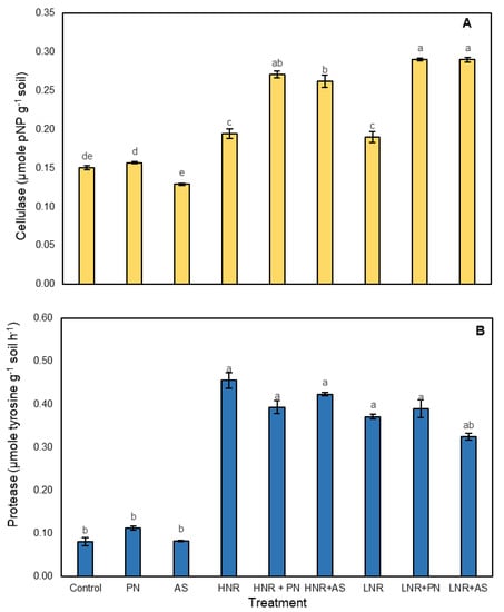To further evaluate the effect of substrate availability on the microbial turnover of C and N, assays were carried out concurrently for protease as well as cellulase. Proteolytic enzymes play a key role in soil N mineralization, comprising a group of extracellular hydrolases that convert proteins to peptides and/or amino acids [97]. Figure 7B reveals that soil protease activities were much lower when residues were absent with the control, PN, and AS treatments, owing to the lack of C sources for heterotrophic microbial metabolism and extracellular enzyme synthesis. Protease activities increased markedly for the remaining treatments that all involved residue addition. Such increases were induced in response to ample availability of organic C and N, but there is no evidence of any effect due to the input of mineral N. Similar findings from previous research concerning soil protease activities have been linked to substrate C:N ratios and the repressive effect of NH4+ or NO3− [16,98,99,100]. In the present study, protease activity was significantly correlated with cumulative CO2 (r = 0.94, p < 0.001), active biomass (r = 0.89, p < 0.001), MBC (r = 0.76, p < 0.05), and cellulase activity (r = 0.71, p < 0.05), which is consistent with previous findings by Geisseler and Horwath [16,98], Geisseler et al. [99], and Mishra et al. [101].