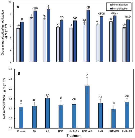 Because soil C and N cycling is closely coupled, 15N pool dilution was used to evaluate the treatments under investigation with respect to gross N mineralization and immobilization. The results are summarized by Figure 8A, which shows that immobilization always exceeded mineralization, even when there was no residue addition with the control, PN, and AS treatments. Both findings can be attributed to the use of a soil that contained carbonaceous residues when collected from a field previously cropped to corn [102]. Despite limited replication that minimized significant differences, net immobilization (Figure 8B) tended to be higher for treatments involving the addition of NH4+ than NO3−, as would be expected from the microbial preference previously documented for N utilization [11,12,22]. Gross mineralization and immobilization were highly correlated (r = 0.91, p < 0.001), as would be expected given their concurrent occurrence as the central processes in soil N cycling [22].