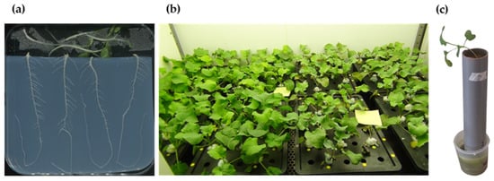 Culture systems used to grow oilseed rape cultivars. (a) Vertically placed agar plates (size: 12 cm × 12 cm); (b) Hydroponic containers (capacity: 8 L); (c) Column filled with soil (d: 5 cm, h: 30 cm).