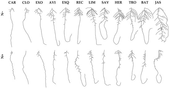 Root morphologies of oilseed rape cultivars grown in vitro with two divergent nitrate supplies. Pictures of representative root organs of 12 contrasting oilseed rape accessions grown with 0.01 mM (upper row, N−) or 10 mM (lower row, N+) nitrate supplies. Accessions are ranked from the left to the right by increasing total root length (TLR) measured at N−. The TRL values were ranging between 12.1 ± 0.9 cm (CAR) and 41.5 ± 2.9 cm (JAS). Cultivar full names are listed in Table S1. Scale bar: 2 cm.