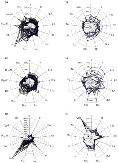 Relative variation of phenotypic traits measured in 55 oilseed rape cultivars cultivated in vitro (a–c) and in 12 cultivars in hydroponics (d–e). The spider plots (a,b,d,e) show the percentage variation of a given trait for every cultivar, normalized by the mean value of the panel, measured during N+ (a,d) or N− (b,e) conditions. Zero percent (blue circle) indicates no difference compared to the mean value of the panel in one condition. The spider plots (c,f) show the percentage variation of a given trait for every cultivar grown during N−, normalized by the value observed during N+ conditions. This defines the responsiveness of one trait to nitrate depletion. Zero percent (blue circle) indicates no difference compared to elevated nitrate conditions. n = 15 plants per genotype and per N condition cultivated in vitro, and 5 plants in hydroponics. Traits are defined in Table 1.