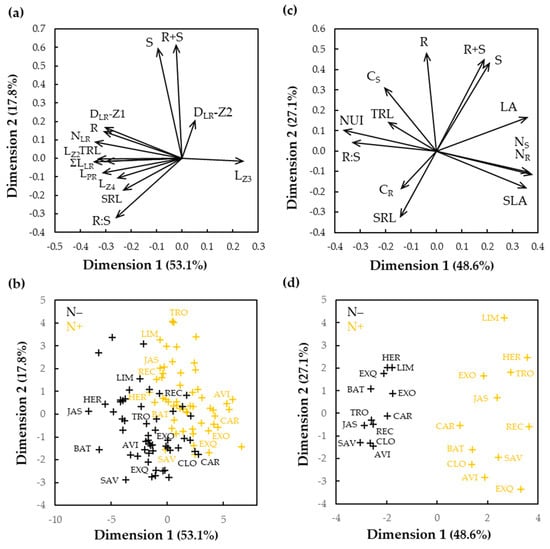 Principal component analysis of 14 phenotypic traits measured in 55 oilseed rape cultivars cultivated in vitro (a,b) and of 13 phenotypic traits in 12 cultivars in hydroponics (c,d). (a,c) Principal component (PC) biplot showing the compositions of the first two PCs, with cumulative variance; (b,d) Representation of the cultivars. Symbols indicate position of the cultivars as determined by their trait values in the two first PCs. Black symbols refer to low nitrate (N−) and yellow symbols to high nitrate (N+) conditions. Traits are defined in Table 1 and cultivars listed in Table S1.