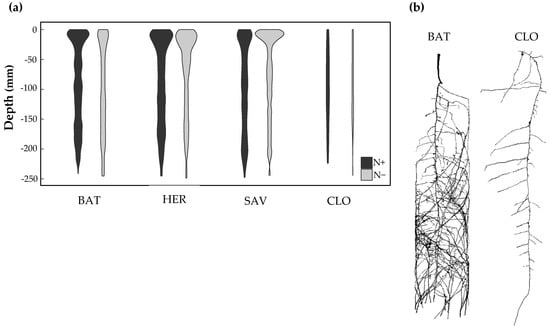 Characterization of the root system architecture in soil-filled column. (a) The violin plots show the distribution of lateral root density, as a function of the column depth. The estimates are based on five replicates of four oilseed rape cultivars cultivated with low (N−) or high (N+) nitrate conditions; (b) Reconstructed images of two contrasting cultivars at N−. Scale bar = 5 cm.