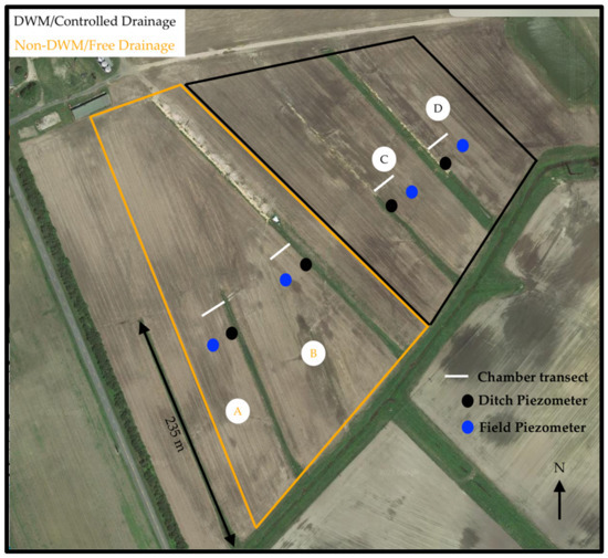 Aerial image of the research site showing the approximate piezometer locations, chamber transect locations, and treatment area borders. Fields A and B were free draining (non-DWM); fields C and D had controlled drainage (DWM).