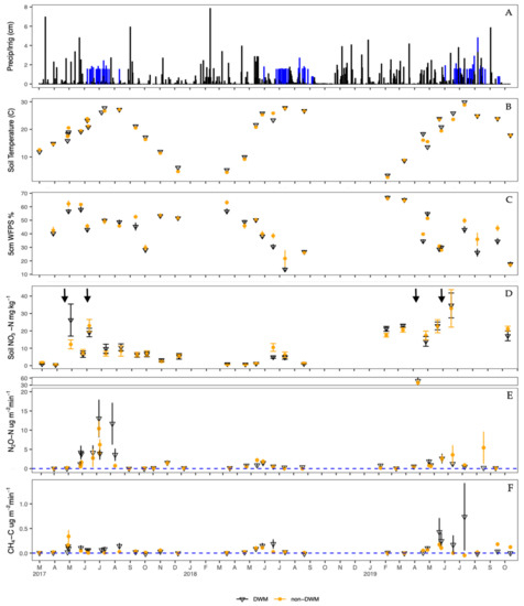 Climactic, soil, and flux variables measured over the course of this study. Arrows mark N fertilization events. Blue bars in panel (A) are irrigation events and black bars are precipitation events. The other measured variables are soil temperature (B), WFPS (C), soil nitrate (D), N2O-N flux (E) and CH4-C flux (F). Dashed blue lines in panels (E,F) mark the value of zero net flux. Mean + SE bars.