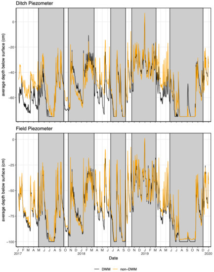 The daily mean piezometer water depth was aggregated by treatment and piezometer location during the inactive and active DWM DCS board periods (Figure 3). In the ditch piezometers, in the DCS inactive (unshaded) periods, the DWM depth values were generally deeper than the non-DWM plot values, indicating spatial heterogeneity across the field. During the DCS active (shaded) periods, however, the lines on Figure 3 tend to converge, indicating that the DCS active installation of boards in the DWM plots increased the ditch piezometer water levels. In the field piezometers, the effect of board placement is less clear. The statistical evaluation of these piezometer data were combined analysis of WFPS data and are found in Section 3.4.