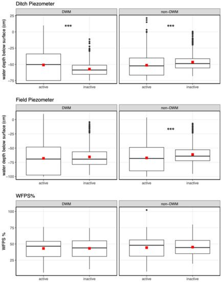 Box plot of the ditch piezometer, field piezometer and %WFPS in surface soil. Data were aggregated by treatment and board period. Asterisks indicate the significance of a Wilcoxon rank sum test for comparison between active DCS versus inactive DCS periods within each treatment (*** indicate p < 0.001; no asterisks indicate p > 0.05). Red squares represent means.