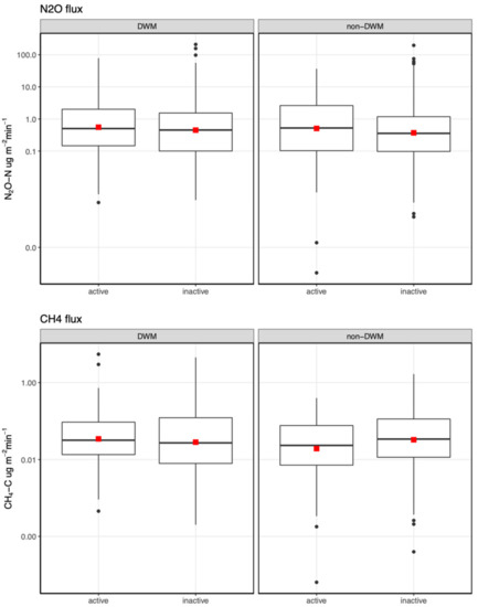 The non-parametric statistical analysis results for dependent variables of ditch piezometer, field piezometer, and surface WFPS showed differences in the interaction of treatment and board period (Figure 4). For the ditch piezometers, the mean water depth below ground was significantly deeper during the inactive DCS period than the active DCS period in the non-DWM sites. However, this trend was reversed in the DWM sites, with a higher mean water depth in the active DCS period compared to the inactive DCS period, indicating that the additional boards in the DWM sites raised the water table near the ditch, even during the dry summer. The field piezometer water levels showed the same trends as the ditch piezometers, except that the mean water level between active and inactive DCS periods was not significantly different in the DWM condition, indicating that the additional boards in the DWM sites had less of an effect on the water table in the mid-field, approximately 15 m from the ditch. The DWM only raised the water table in the mid-field piezometers to the same level as the non-DWM plots in the active DCS season, but did not exceed it, as was the case for the ditch piezometers (Figure 4). The WFPS showed no significant differences by treatment or board period, indicating the DWM did not affect near surface moisture content. The same non-parametric analysis for gas fluxes showed no significant differences by treatment or board period, indicating the DWM did not impact the soil gas fluxes in the fields (Figure 5).