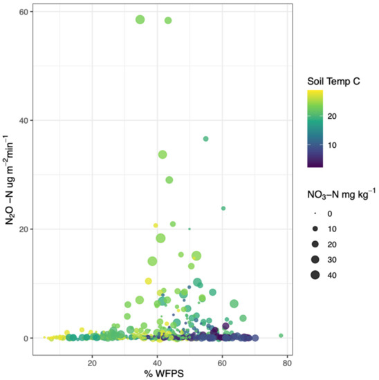 The multiple regression results align with the published literature demonstrating that key variables of soil nitrate, temperature, and soil moisture play a role in controlling N2O emissions (Figure 6; Equation (2)) [42,52]. The variation in these parameters fit within the context found for N-fertilized agricultural fields [53].