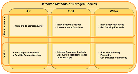 Nitrogen species are present in both organic and inorganic form and travel from one environment to another through the nitrogen cycle. Researchers have explored various methods to monitor this flow effectively. Most of the attention is directed to electrochemical and optical detection methods. Both methods have advantages and disadvantages depending on the target species and the detection environment.