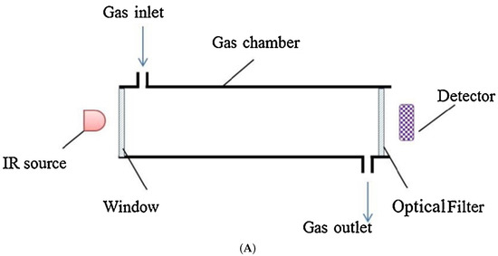 (A) Schematic of typical NDIR sensor for gas detection. (B) Infrared absorption features for several gases. [Reprinted with permission from ref. [34]].