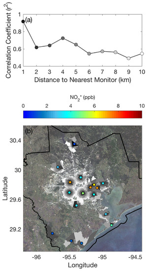 - Demetillo, M.A.G.; Navarro, A.; Knowles, K.K.; Fields, K.P.; Geddes, J.A.; Nowlan, C.R.; Janz, S.J.; Judd, L.M.; Al-Saadi, J.; Sun, K.; et al. Observing Nitrogen Dioxide Air Pollution Inequality Using High-Spatial-Resolution Remote Sensing Measurements in Houston, Texas. Environ. Sci. Technol. 2020, 54, 9882–9895. [Google Scholar] [CrossRef]