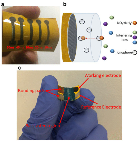 Garland et al. showed how to employ a low-cost UV laser to make a LIG sensor for the soil samples’ ion-selective detection of a plant’s nitrogen ions. They created LIG electrodes with different laser pulse widths on polyimide/Epson printer paper and found electrodes with a pulse width of 20 ms to be the most effective. The LIG electrode was then used with an ionophore membrane that is selective for NH4+ or NO3− to develop the ISE (Figure 7).