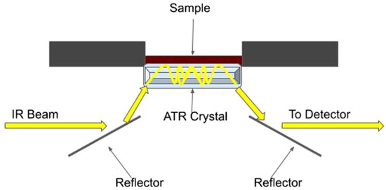 ATR spectroscopy illustration. When an infrared beam enters the ATR device, it is reflected by a series of reflectors and directed toward the ATR crystal that is in contact with target sample. The light is reflected by the crystal producing an evanescence. After leaving the ATR crystal, the reflected energy is directed toward a spectrometer, which generates a sample reflectance spectrum. [Reprinted from ref. [13], by Lamar Burton1, K. Jayachandran2 and S. Bhansali; via IOP (CC BY 4.0)].