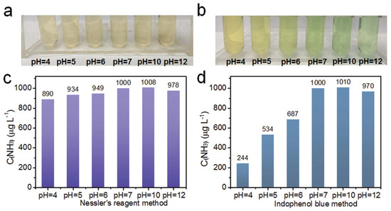 Ammonia concentration detection using (a,c) Nessler’s reagent and (b,d) indophenol blue at different pH. [Reprinted with permission from ref. [75]].