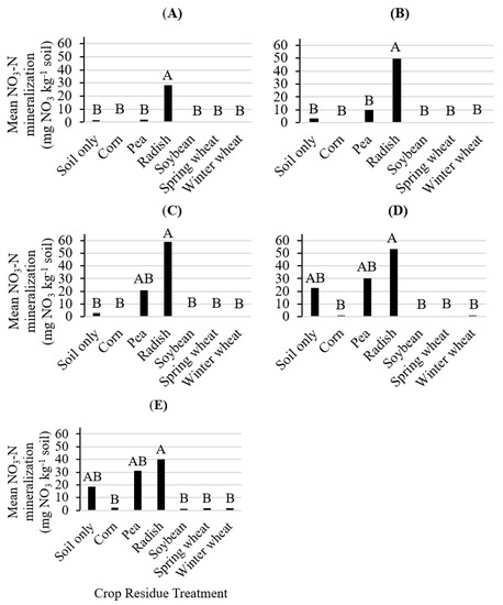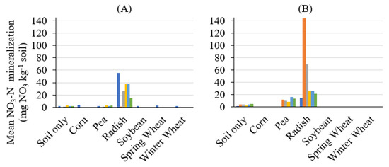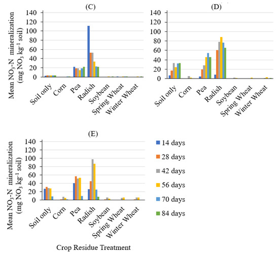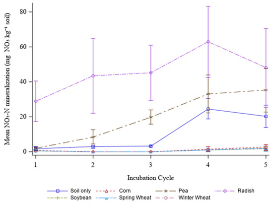 When evaluating the individual crop residue treatments and their contributions to soil NO3-N mineralization averaged over all incubation cycles these can be ranked as forage radish > pea > bare, unamended soil ≥ corn = winter wheat = spring wheat = soybean (47.80 > 19.86 > 10.57 > 0.94 = 0.76 = 0.70 = 0.66 mg NO3-N kg−1, respectively). Forage radish is significantly different from all crop residues treatments and the bare, unamended soil. The pea crop residue treatment is significantly different from the bare, unamended soil. The corn, soybean, spring wheat, and winter wheat crop residue treatments are always less than mg NO3-N kg−1, are similar, and significantly different from the forage radish, pea, and unamended soil control.