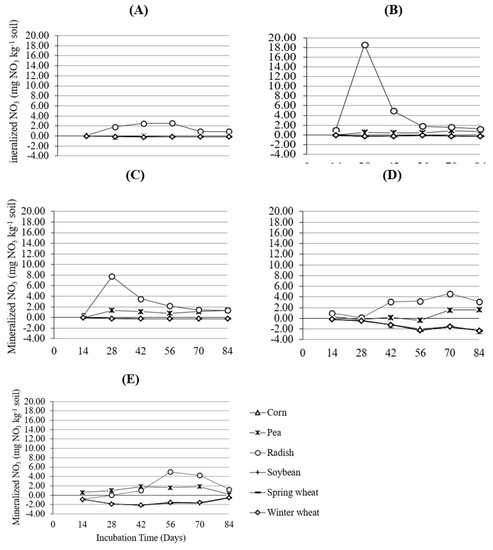 The following supporting information can be downloaded at: https://www.mdpi.com/article/10.3390/nitrogen3020011/s1, Table S1: Mean and cumulative NO3-N mineralization for nine incubation cycles and overall mean for corn, flax, pea, radish, soybean, spring wheat, and winter wheat crop residues for Heimdal-Emrick, Fargo, and Forman soil series in North Dakota.