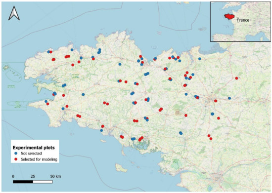 Locations of experimental fields in the network in Brittany, France (red points indicate the 67 fields selected).