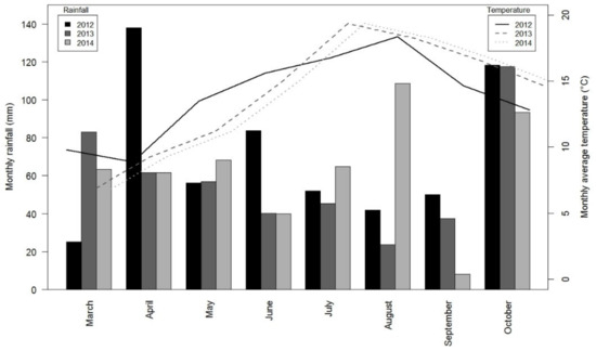 Monthly rainfall and mean air temperature from March-October for the 3 years of the experiment.