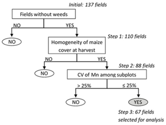 Data were screened to exclude the fields in which agronomic or measurement problems had occurred. They were represented in a decision tree with three nodes (Figure 3): (i) the presence of weeds, which can compete with maize and bias estimates of Mn; (ii) non-homogeneous maize cover at harvest, which can bias measurements of Nf and N uptake and, thus, estimates of Mn; and (iii) excessively high variability in Mn among the three subplots. We considered, as outliers, fields whose coefficient of variation of Mn was greater than or equal to 25% (i.e., the 95th percentile) in 2012, 2013, or 2014. To retain the most consistent data and, thus, decrease uncertainty in estimates of Mn, we excluded these fields from further analysis and modeling.