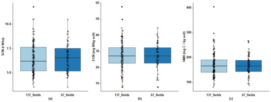 Boxplots of (a) soil organic nitrogen (SON), (b) extractable organic nitrogen (EON), and (c) soil microbial biomass (SMB) for all 137 fields and for the 67 fields selected from the network. Whiskers extend to 1.5 times the interquartile range.