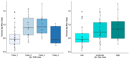 Boxplots of Vnmean as a function of (a) soil organic nitrogen (SON) class (class_1: SON < 5.7 t N ha−1; class_2: [5.7; 7.15]; class_3: [7.15; 8.2]; class_4: >8.2 t N ha−1) and (b) I_Sys class. Whiskers extend to 1.5 times the interquartile range.
