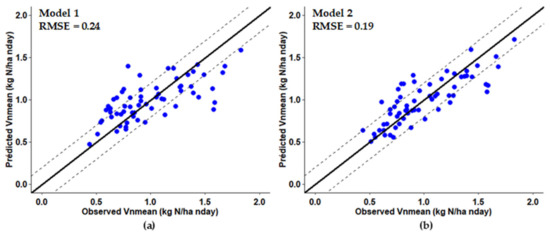Comparison of observed Vnmean to that predicted by (a) model 1, whose covariates were the basic soil parameters and I_Sys, and (b) model 2, with SMB and EON as additional variables. Solid lines are 1:1 lines, while dashed lines indicate ± 0.2 kg N ha−1 nday−1 around each 1:1 line. (RMSE: Root Mean Square Error).