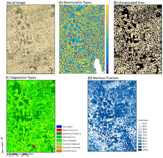 Study area discretized into: (A) geomorphic polygon types and features with a general relationship of unsaturated yellow regions and saturated blue regions, where 1 corresponds to LCP troughs (5.0% area), 2 corresponds to FCP troughs (16.1% area), 3 corresponds to HCP troughs (5.1% area), 4 corresponds to LCP centers (12.5% area), 5 corresponds to FCP centers (11.3% area), 7 corresponds to LCP rims (17.6% area), 8 corresponds to FCP rims (27.3% area), and 9 corresponds to HCP centers (5.1% area); (B) Color orthomosaic and its masked versions showing only unsaturated and saturated areas, respectively; (C) coverage of plant community type, where certain species are limited to saturated soils; and (D) a combination of topographic and vegetative remote observations identifying wetness fractions, where darker blues correspond to more saturated areas. See Appendix A for additional details on geospatial approaches.