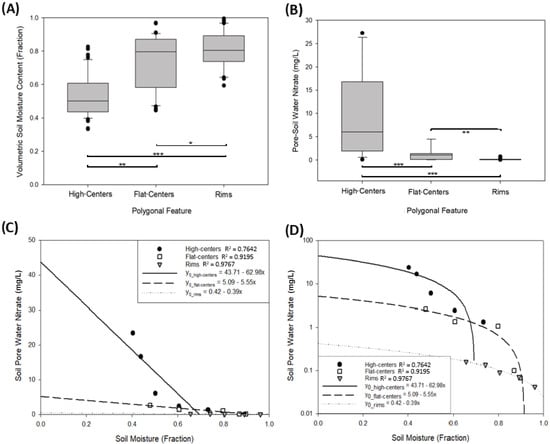 Ranges of moisture content (A) and NO3− concentration (B) distributed by unsaturated polygonal microtopographic features (high-centers, flat-centers, rims). The data used for the ranges displayed in (A,B) were not co-located but were distributions from each unsaturated feature for all NO3− and moisture data collected. The whisker extent and lines within the grey boxes indicate the 90%, 75%, 50%, 25%, and 10% statistical quantile distributions (see Table A1 for additional details), and statistical outliers are indicated by black circles. All p-values for pairwise comparisons between polygon features for (A,B) are <0.05, and asterisks displayed denote the level of significance for each comparison (*** indicates p ≤ 0.001; ** indicates p ≤ 0.01; * indicates p ≤ 0.05). (C,D) both show identical data and regressions with (C) displaying a linear y-axis scale, and (D) displaying a logarithmic y-axis scale for multiple visual perspectives. Both (C,D) show plots of the inverse statistical quantile distribution (see Table A1 for additional details) regressions of NO3− concentrations and soil moisture content for high-centers (black circles), flat-centers (open-squares), rims (grey triangles), and the linear regression equations for high-centers (solid line), flat-centers (dashed line), and rims (dotted line). Regression coefficients of determination are provided in the legends.