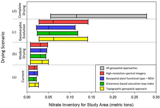 NO3− inventories (Table A2) of the study location were calculated using Equation (1), the NO3− and soil moisture quantiles defined in Table A1, the four geospatial approaches defined above and in Figure 2, and the drying scenarios defined in the discussion and Figure 4.