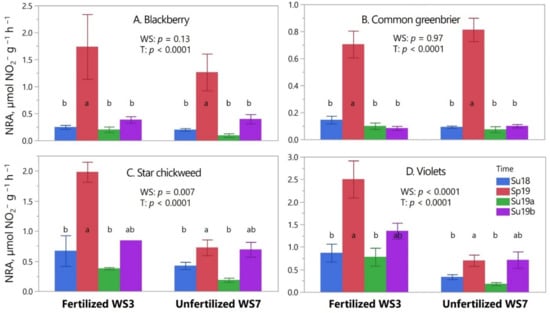 When comparing herb-layer foliage NRAA across four sampling campaigns (one spring campaign and three summer campaigns) in fertilized WS3 and unfertilized WS7, only Time (i.e., sampling campaign) was a statistically significant factor (p < 0.0001). That is, herb-layer NRAA was greatest in the spring (7.9 µmol NO2− m−2 h−1) relative to NRAA of the summer campaigns (3.2–6.5 µmol NO2− m2 h−1). A fertilization effect on NRAA was not detected (i.e., WS p > 0.05) even though some species had greater NRA in response to fertilization (Figure 2).