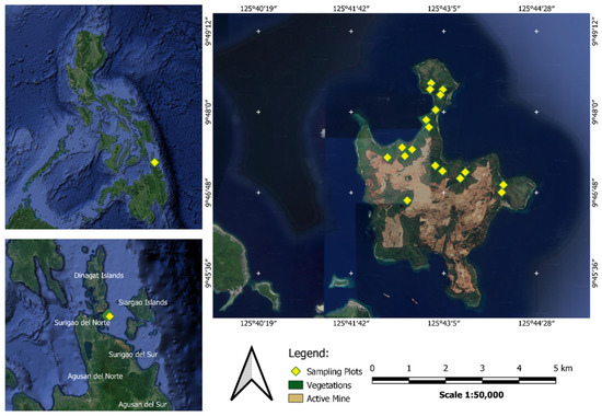 The Taganaan Nickel Mining Project of the Hinatuan Mining Corporation has been in operation in Hinatuan Island, Surigao del Norte, Philippines since 1981. Hinatuan Island is one of the 11 islands under the political or administrative jurisdiction of the Taganaan Municipality in Surigao Del Norte located about 24 km east of Surigao City. Hinatuan Island has a generally lower elevation, ranging from 10 to 50 masl, comprising around 88% of the total land area. It has a population of 39,842, and an approximate total land area of 1275.00 hectares, with around 773.77 hectares covered by an approved Mineral Production Sharing Agreement (MPSA 246-2007-XIII) executed by and between HMC and the Philippine Government in 2007 (Hinatuan Mining Corporation, Taganaan Nickel Project, 2016). Sarmiento [44] reported that the vegetation types of ultramafic Hinatuan Island were generally represented by mangrove in the coastal areas and by secondary growth forest, grasslands, and farmlands on the inland side of the island, in an ultramafic soil environment.