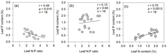 Interestingly, the leaf N and leaf P contents of all tree species revealed significant (r = 0.70; p < 0.01) correlations. It was also observed that the leaf N:P ratios’ correlations with the leaf P content of all species were significant (r = 0.49; p < 0.01) but were not significant with leaf N (r = 0.13; p = 0.60) content (Figure 3).